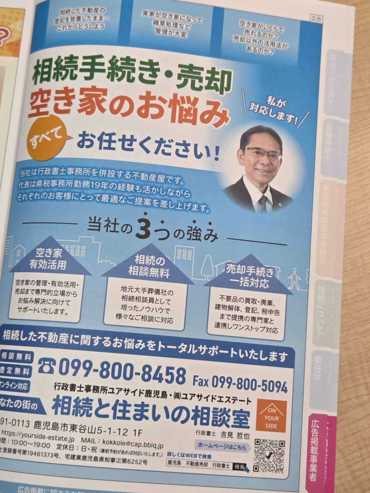 それで、昨年、この冊子への広告掲載のお話しをいただいた際に、できるだけ多くの相続人の皆様に弊社を知っていただこうと思い掲載してもらうことにしました。